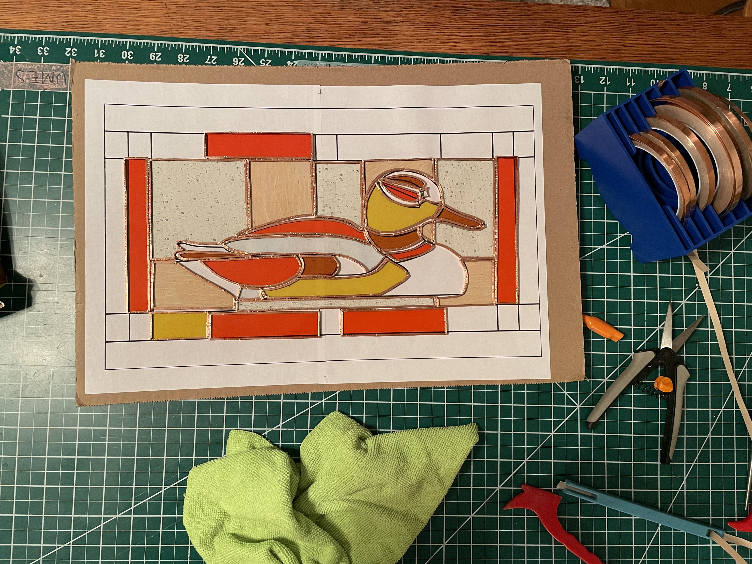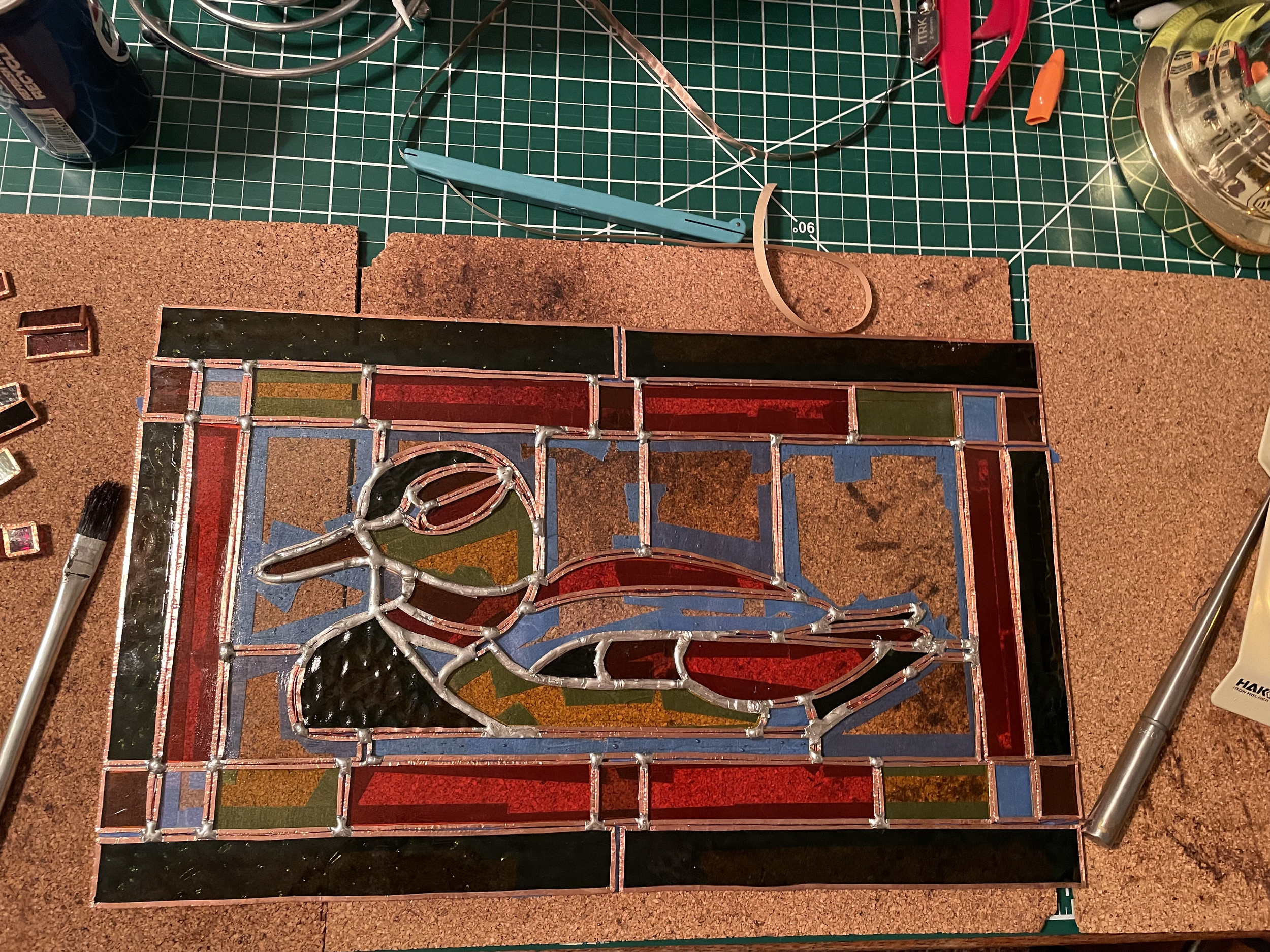 A stained glass duck. Original pattern and hand-crafted panel.