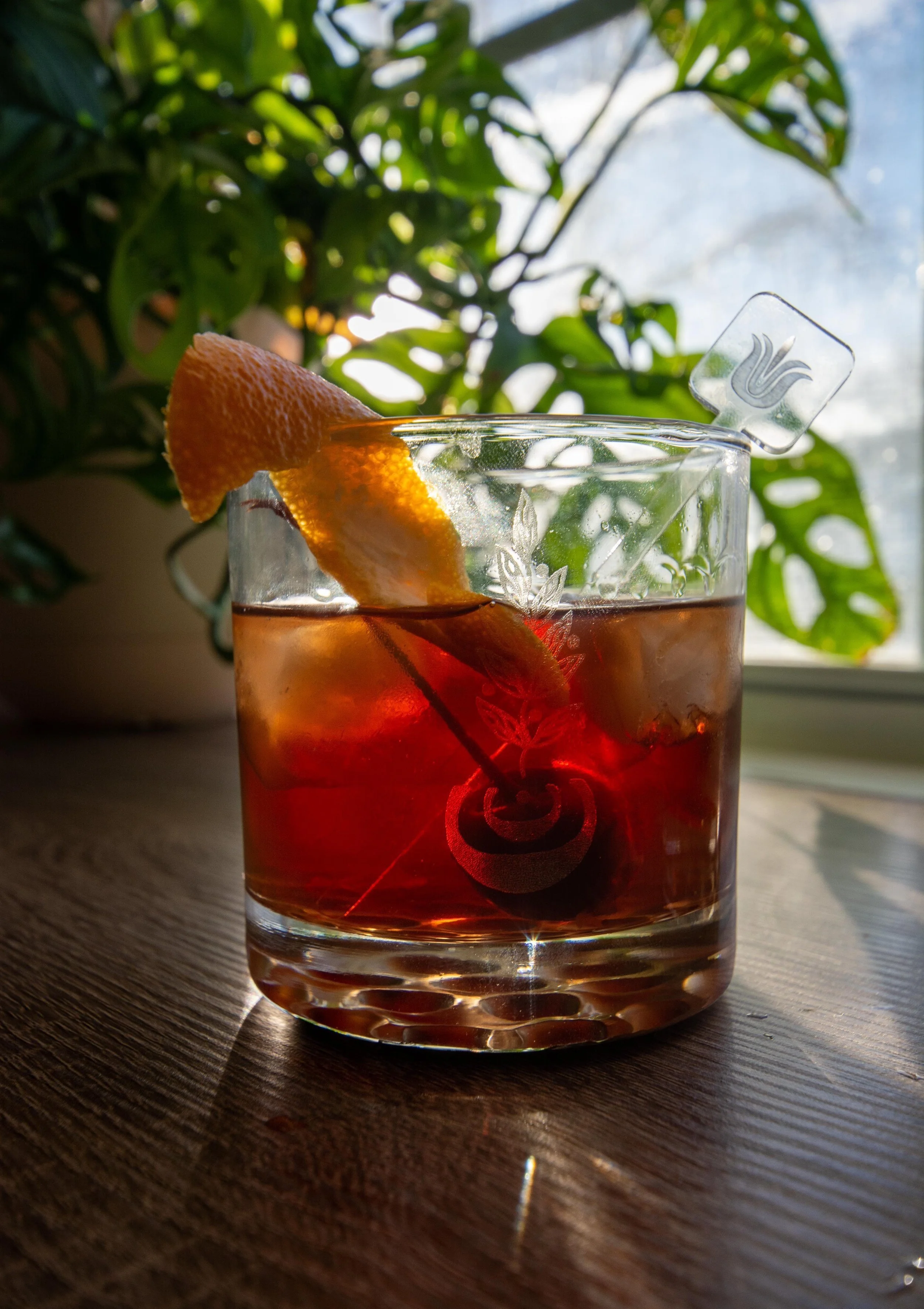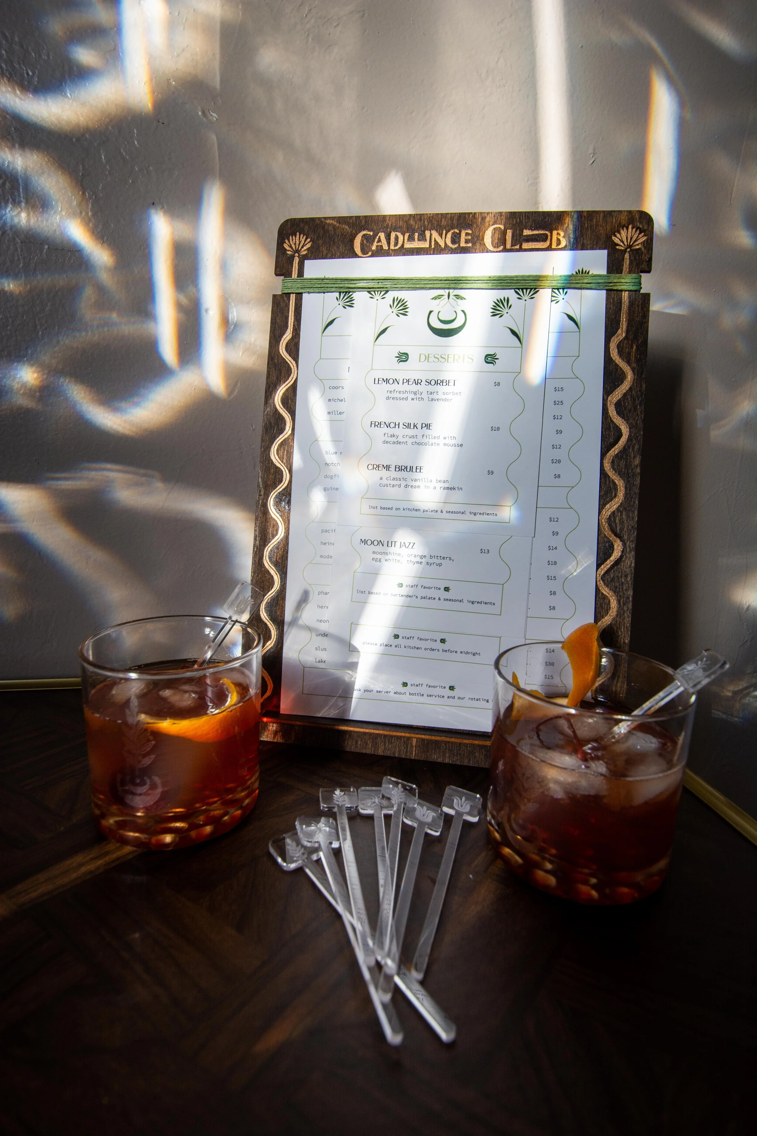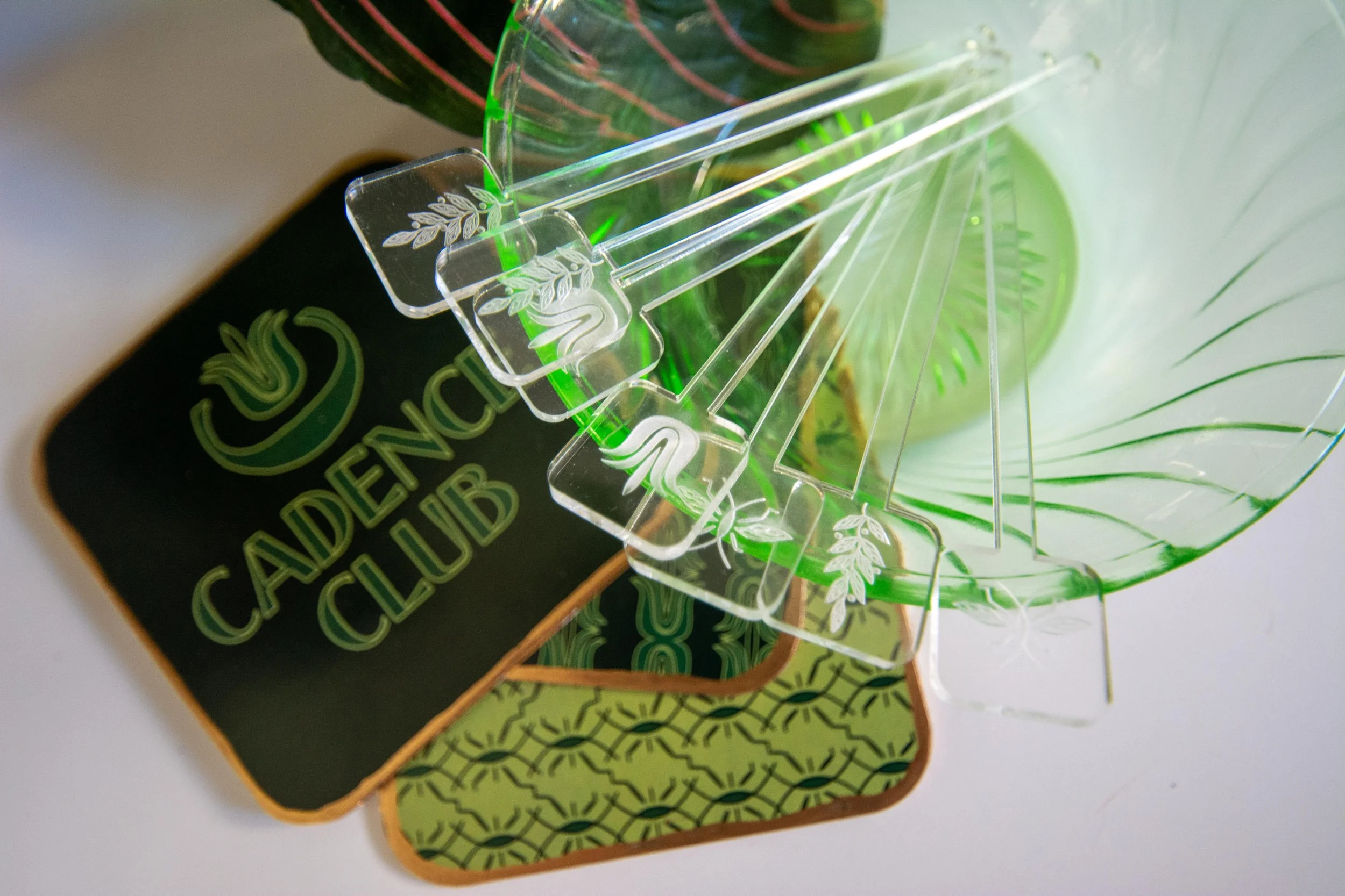 Stir sticks for drinks with flower, vine, and katydid icons.