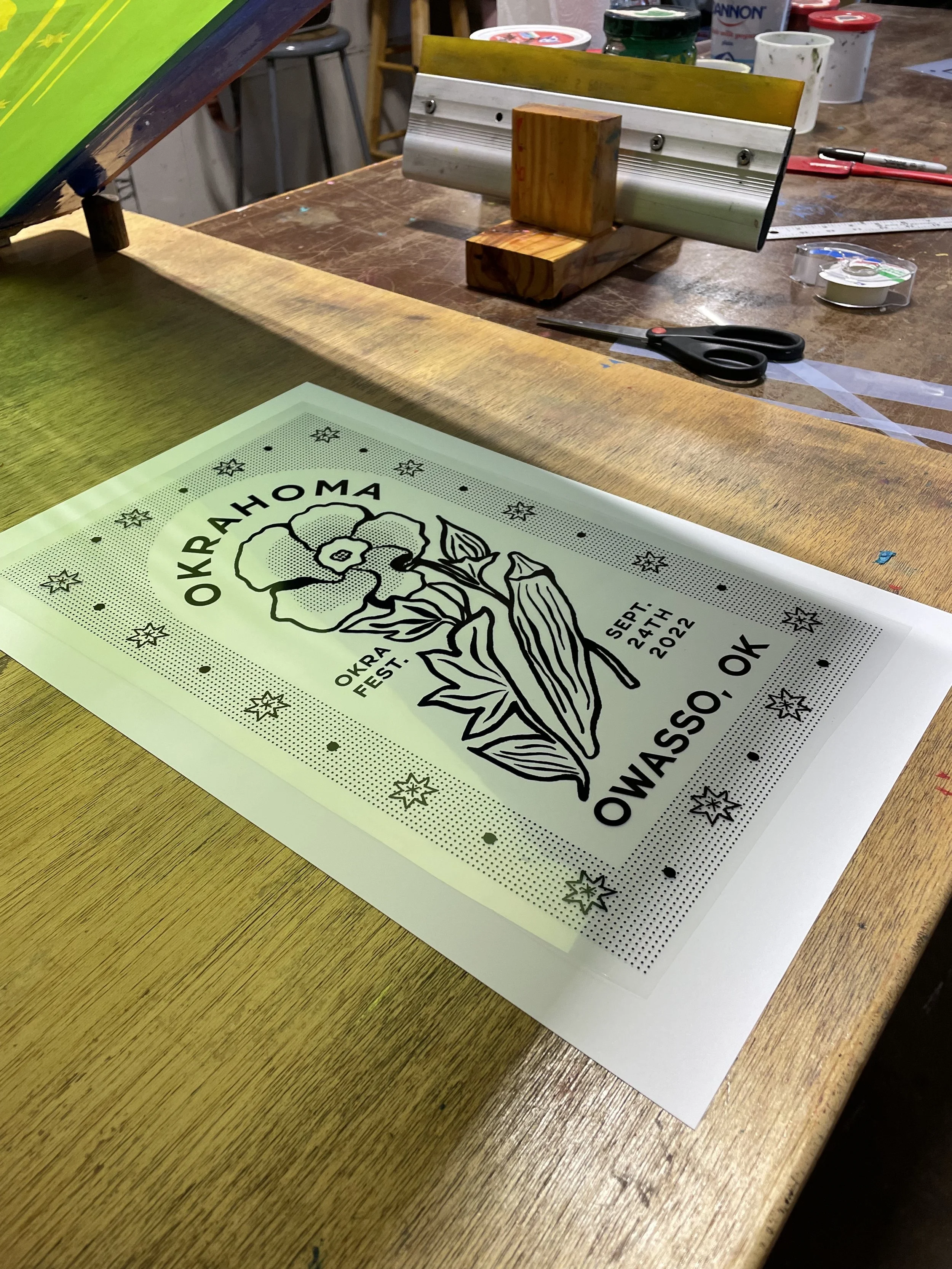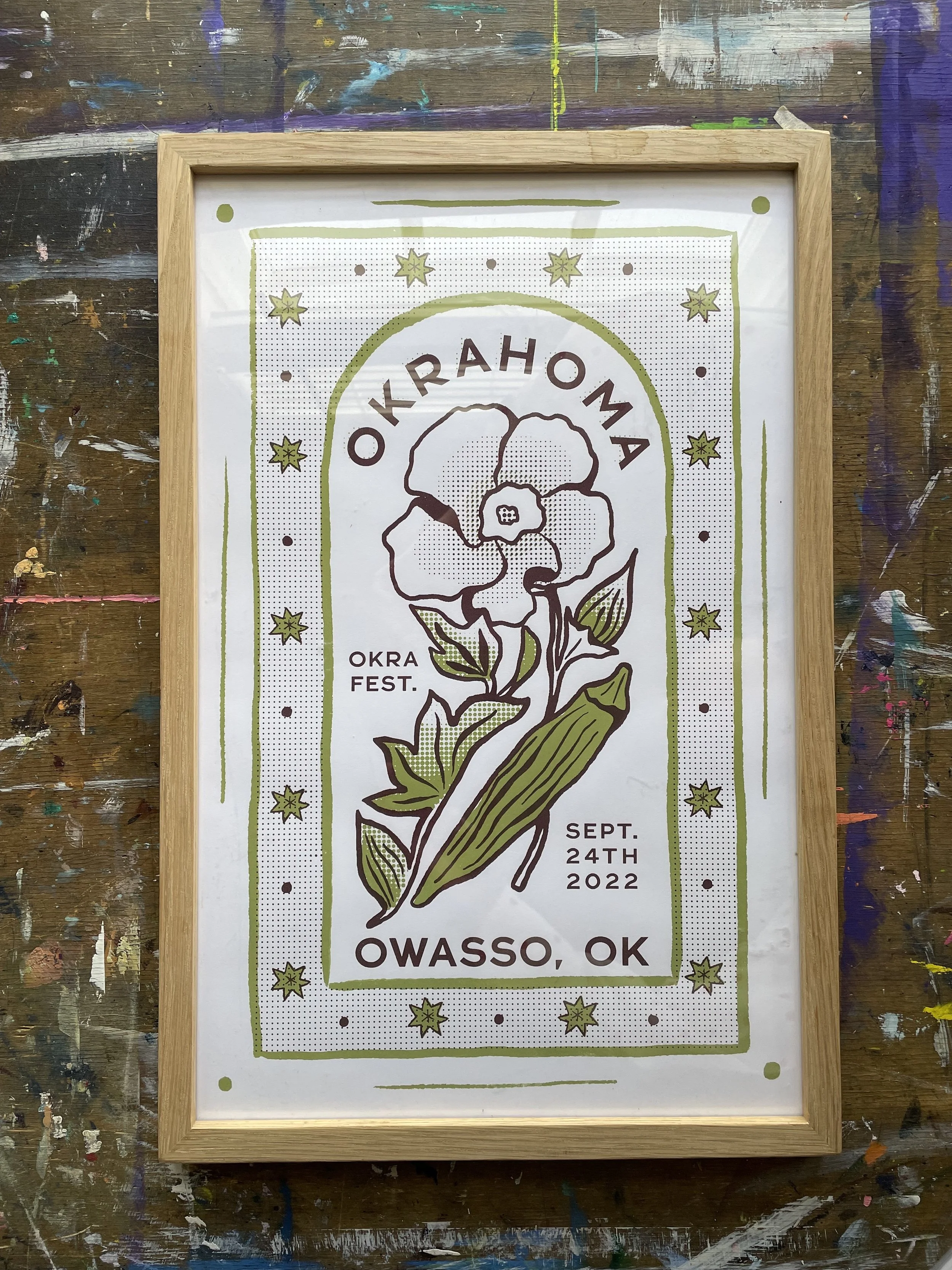Screen printed poster of a fictitious Okra Festival in Oklahoma.
